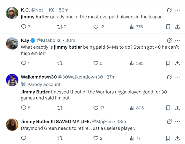 还有很多勇士球迷怒喷巴特勒是联盟最高薪低能的球员,拿5400万什么都做不到。